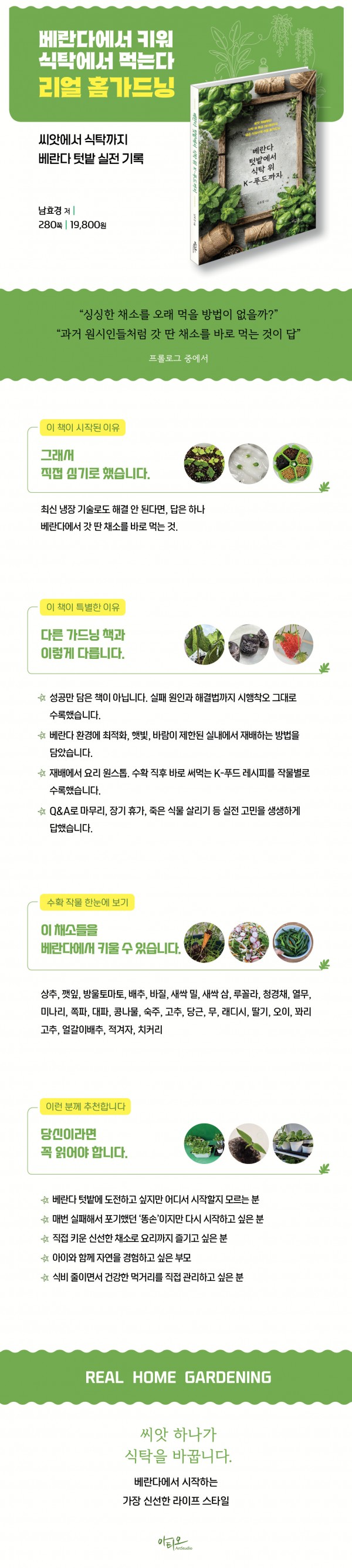 베란다 텃밭에서 직접 키운 채소를 수확해 요리까지 이어지는 완결형 리얼 홈가드닝 가이드 북입니다. ‘싱싱한 채소를 오래 먹을 방법이 없을까’라는 단순한 의문에서 출발해, 수많은 실패와 깨달음을 거쳐 완성한 진짜 재배 노하우를 기록했습니다.